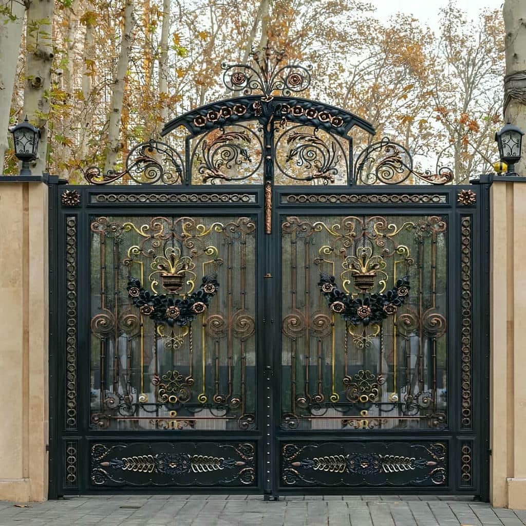 درب باغی ویلایی لاکچری با فرفورژه سنگین مدل فرفورژه با طرح های پیچیده و ظریف ساخته می شود که نمایی باشکوه و سلطنتی به ورودی ویلا می بخشد.