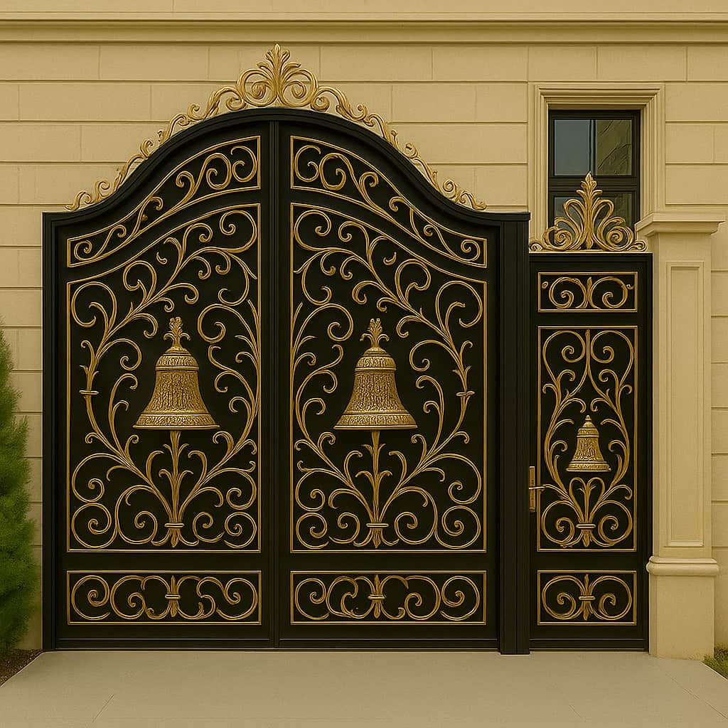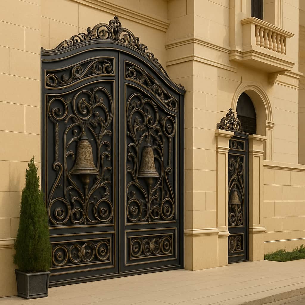 درب مدل زنگوله با الهام از نقوش سنتی ایرانی طراحی می شود و در تولید آن از ورق های فولادی سنگین و فرفورژه تزئینی دست ساز استفاده می گردد. ساخت این درب با فناوری جوش CO₂ صنعتی انجام شده تا اتصالات کاملاً مقاوم و ماندگار باشند. پوشش رنگ پودری الکترواستاتیک و زیرسازی ضدزنگ, مقاومت بالا در برابر رطوبت, آفتاب و فرسایش ایجاد می کند. ترکیب خطوط منحنی با فرم زنگوله ای در مرکز درب, زیبایی سنتی و اصالت را در طراحی آن نمایان می سازد.